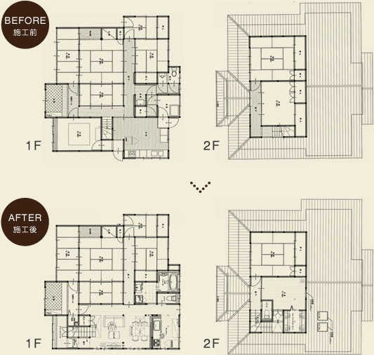 古くなって使い勝手の悪い部分や老朽化した箇所を補修しつつ、自分達のライフスタイルに合わせた空間へと大改造ビフォーアフター。
